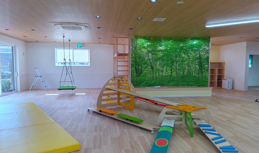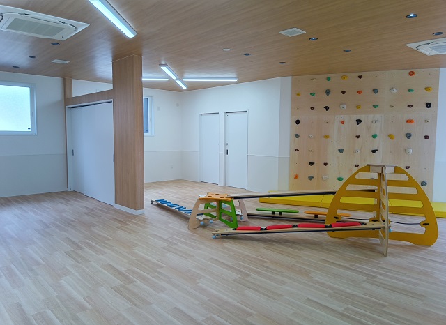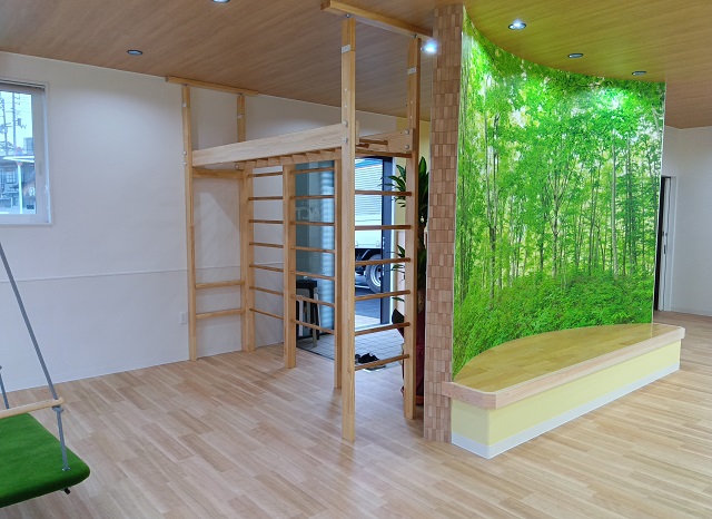 教室内にはボルダリング、ブランコ、ろくぼく等アクティブに体を動かせる遊具が設置されています。